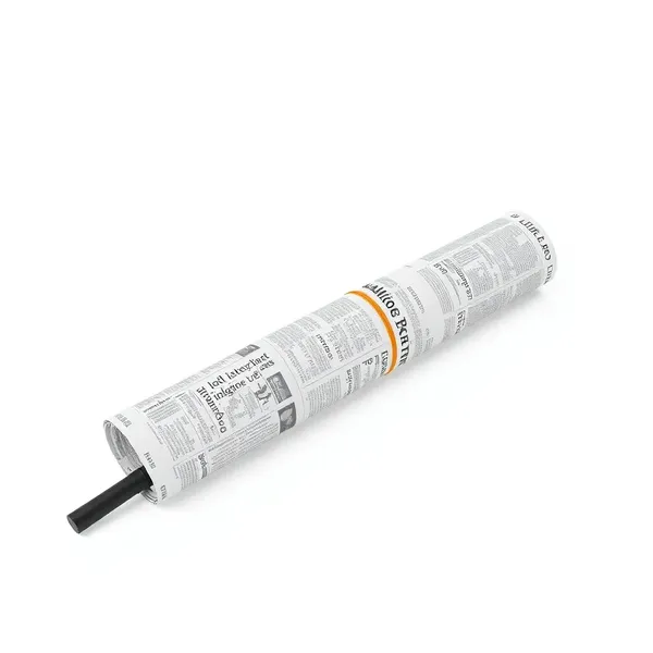 AI Image: A full oversized rolled up newspaper used as a walking cane, very long thick cylinder shape reaching