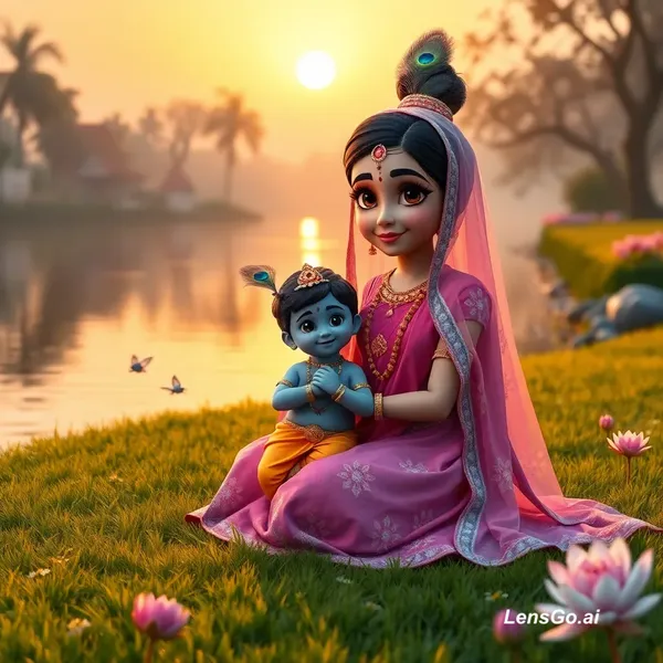 Ultra-cute young Radha sitting peacefully on soft green grass beside a calm Yamuna river at sunset, wearing a pink lehenga and blue veil with delicate golden embroidery, big expressive eyes, gentle smile, peacock feather ornament on head, Vrindavan temple scenery and trees around, flowers blooming near the river bank, warm golden sunlight reflecting on water. In front of her, little Krishna standing close and lovingly talking to her, blue skin, yellow dhoti, peacock feather crown, sweet innocent expression. Devotional Vrindavan atmosphere, butterflies and lotus near the river, cinematic lighting, depth of field, ultra-detailed, 3D Pixar-style hyper-realistic cartoon, adorable characters, character consistent, vertical composition --ar 9:16