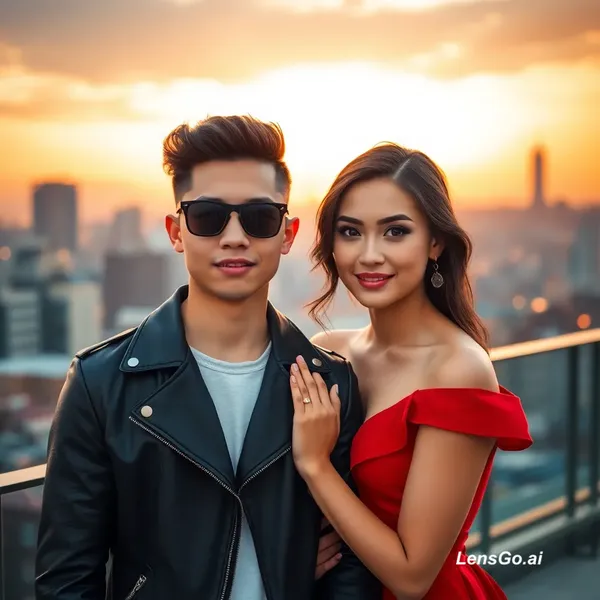 Edit this photo of a young couple but keep their original faces exactly the same without changing facial features. Do not modify their face structure, eyes, nose, lips, or skin tone. Only change the clothes and background. The boy wearing a stylish black leather jacket and sunglasses, the girl wearing a beautiful red elegant dress. Change the location to a romantic rooftop city at sunset with golden lights and cinematic atmosphere. Ultra realistic photography, DSLR quality, natural skin texture, sharp focus, 8K details, professional photoshoot lighting, depth of field.