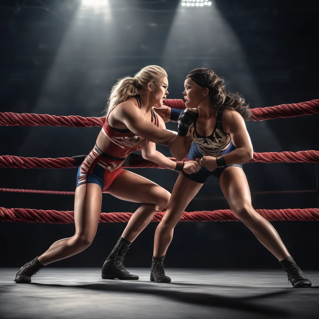 AI Image: Ultra-realistic image of two attractive American female wrestlers in a dramatic wrestling pose. Athl