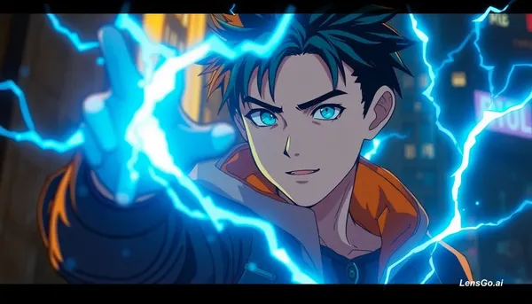 anime boy protagonist, futuristic cyberpunk style, blue electric powers, consistent character design, anime cinematic lighting, studio anime style