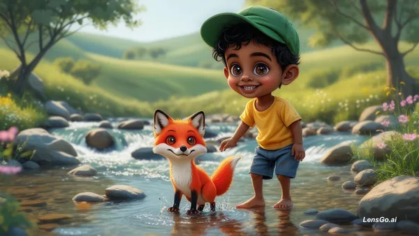 A high-quality 3D cartoon style illustration of a young Somali boy named Hirsi playing with his fox best friend near a clear flowing river. Hirsi has warm brown skin, big expressive eyes, short black hair, wearing a green cap, yellow t-shirt and blue shorts, barefoot and smiling happily. The fox is small, fluffy, bright orange with white chest and tail tip, playful and friendly. They are in a beautiful green landscape with trees, flowers, rocks, and soft sunlight. Background includes rolling hills., shot on modular 8K digital cinema camera, standard prime lens, 35mm standard natural perspective, f/1.4 shallow depth of field, creamy bokeh, professional cinematography, ultra-detailed, 8K resolution, film grain, cinematic color grading