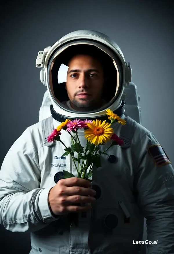AI Image: Studio portrait of an astronaut holding flowers, dramatic lighting