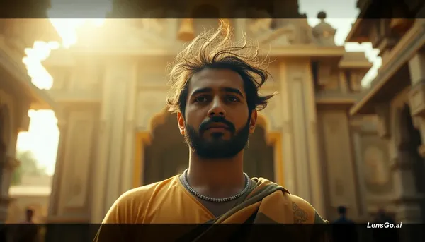 AI Image: A cinematic romantic scene of an Indian man standing at a grand temple entrance, early morning soft