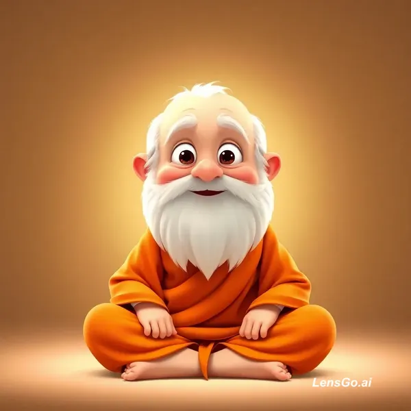 AI Image: "cute old yogi, long white beard, big kind eyes, orange robes, sitting cross-legged, peaceful smile,