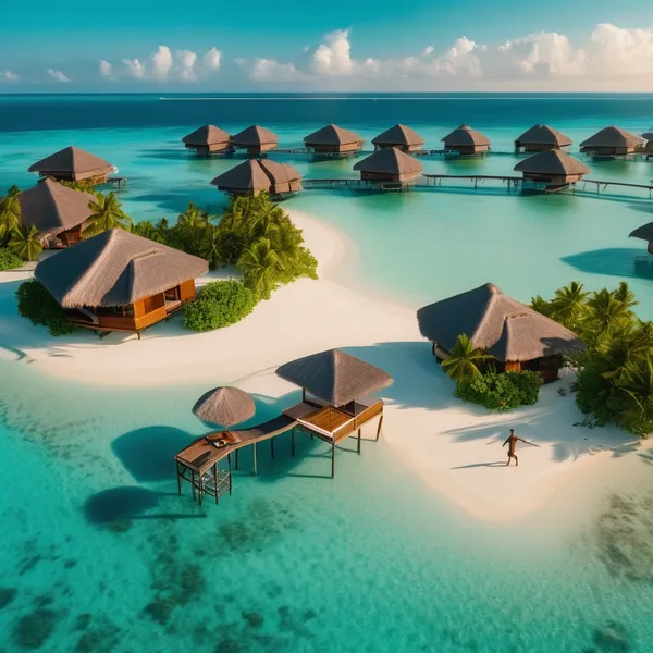 A man dancing in the morning Luxurious overwater villa in the Maldives at golden hour, crystal clear turquoise lagoon, thatched roof bungalow with private infinity pool, bioluminescent water reflections, drone aerial view, ultra-realistic travel photography, 8k resolution