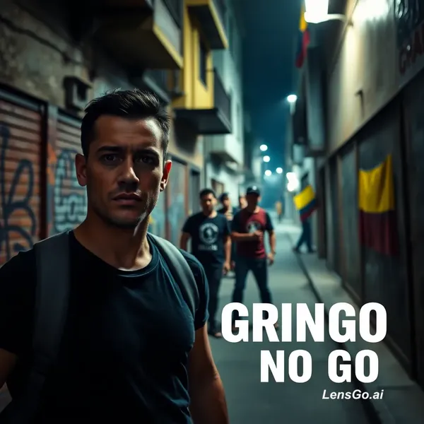 Cinematic YouTube thumbnail, travel vlog style, a foreign traveler standing in a dangerous street area of Bogotá at night, tense expression, dim street lights, rundown buildings, graffiti walls, narrow street perspective, Colombian flag visible on a wall, a group of intimidating local street guys in the background wearing casual street clothes, dramatic lighting, gritty urban atmosphere, high contrast, documentary style realism, shallow depth of field, vibrant colors, YouTube thumbnail composition, space for bold text GRINGO - NO GO