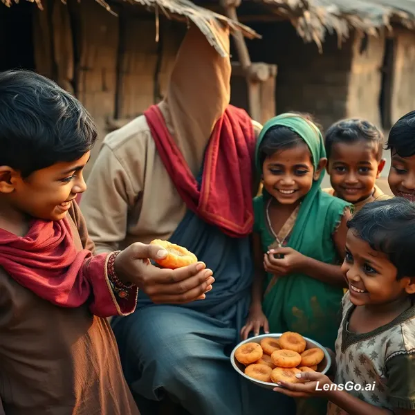 AI Image: Kind Indian farmer distributing jalebis to poor village children, kids smiling happily, simple torn