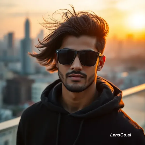 A young confident Indian man standing on a rooftop at sunset, city skyline in the background, wearing a modern black hoodie and sunglasses, wind blowing his hair, dramatic golden hour lighting, ultra realistic, cinematic shadows, depth of field, 4K quality, highly detailed face, sharp jawline, intense expression, motivational vibe, volumetric light, realistic skin texture, shot on DSLR, bokeh background