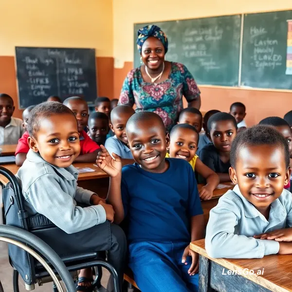 A Nigerian primary school classroom with diverse children learning together, including a child in a wheelchair, a child using a hearing aid, and another with autism, teacher wearing Ankara outfit smiling and assisting, classroom with chalkboard and wooden desks, warm natural lighting, realistic photography, emotional and inspiring, African setting, high detail