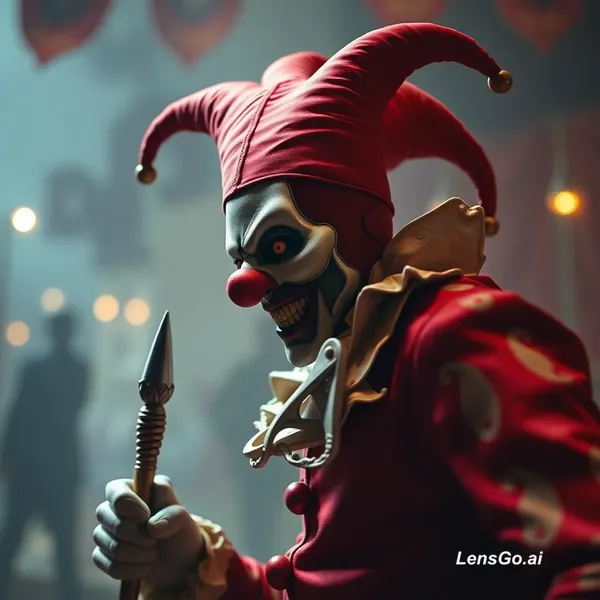 AI Image: Make a scary boss fight into with this jester he is the boss like in a empty lonely circus.