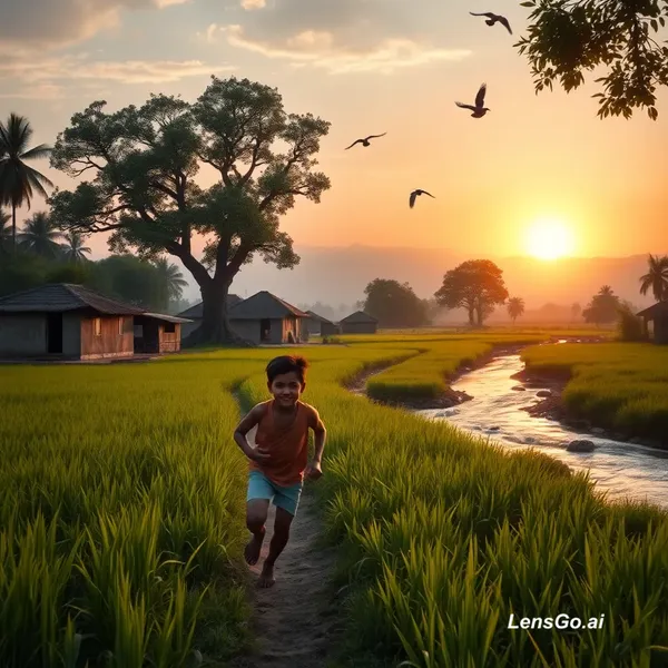 AI Image: Peaceful Indian village at sunrise, a young boy runs through green fields, birds flying, old farmer