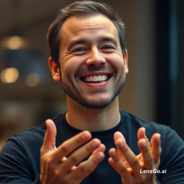 AI Image: A high-quality, realistic video of a man with a joyful expression, speaking enthusiastically about a