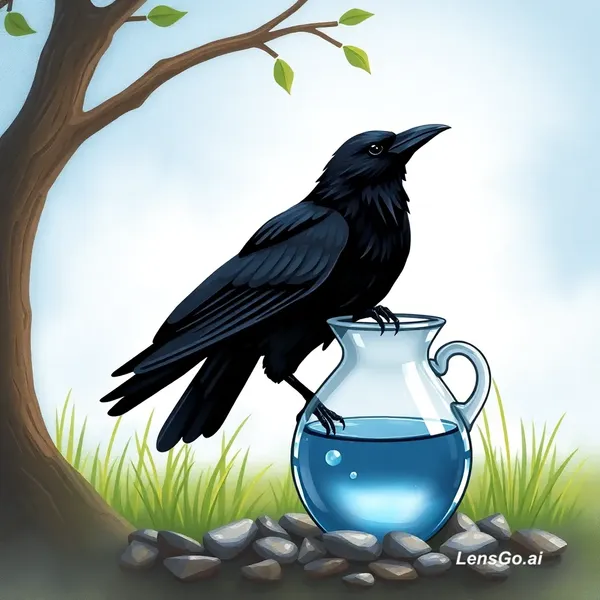 One hot day, a thirsty crow flew all over the fields looking for water. For a long time, he could not find any. He felt very weak, almost lost all hope. Suddenly, he saw a water jug below the tree. He flew straight down to see if there was any water inside. Yes, he could see some water inside the jug! The crow tried to push his head into the jug. Sadly, he found that the neck of the jug was too narrow. Then he tried to push the jug to tilt for the water to flow out, but the jug was too heavy. The crow thought hard for a while. Then, looking around it, he saw some pebbles. He suddenly had a good idea. He started picking up the pebbles one by one, dropping each into the jug. As more and more pebbles filled the jug, the water level kept rising. Soon it was high enough for the crow to drink. His plan had worked! note : i am making a realistic on this story please give this story image and also explain this story i am making 6 mint video on this story