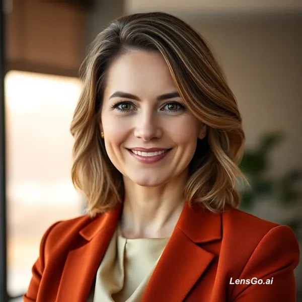 Professional corporate headshot of a 38-year-old Dutch woman, shoulder-length dark blonde hair with soft natural waves, warm friendly confident smile, hazel-green eyes, subtle makeup, small gold stud earrings, wearing a terracotta-rust blazer over a cream silk blouse, photographed in a modern office with warm golden hour window light, shallow depth of field, softly blurred neutral background, shot on Sony A7 IV with 85mm f/1.4 lens, editorial fintech magazine style, photorealistic, sharp detail on face, cinematic color grading, 4K