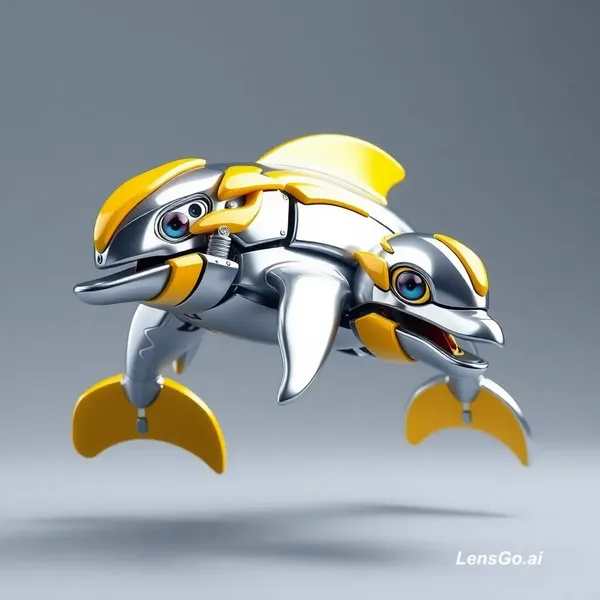 AI Image: Create a 3D Pixar style image of a transformer dolphin in silver, yellow and shiny show it to be ver