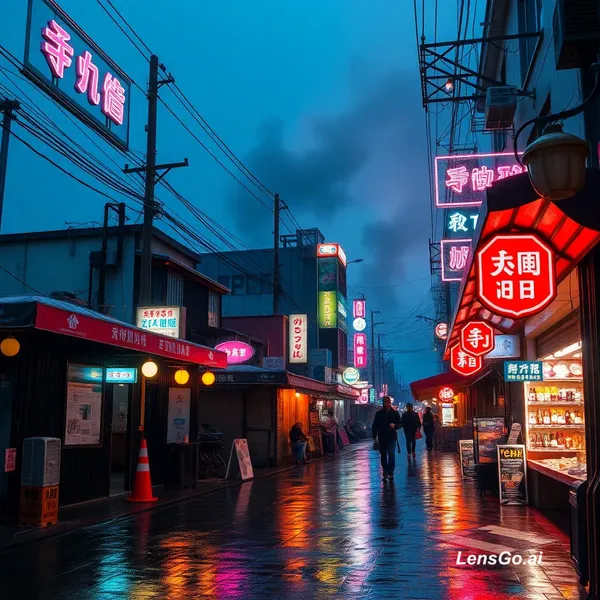 AI Image: Cyberpunk street market in the rain, neon signs and steam rising
