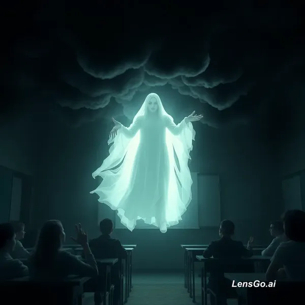 AI Image: A ghostly pale woman emerges from the black cloud. She floats in the classroom. Lights flicker. Stud
