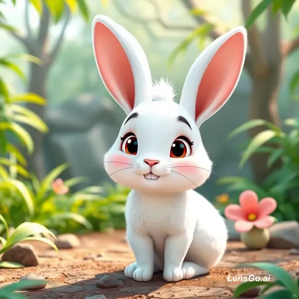 AI Image: cute white rabbit cartoon, pixar style, jungle background, 3D cartoon, ultra HD