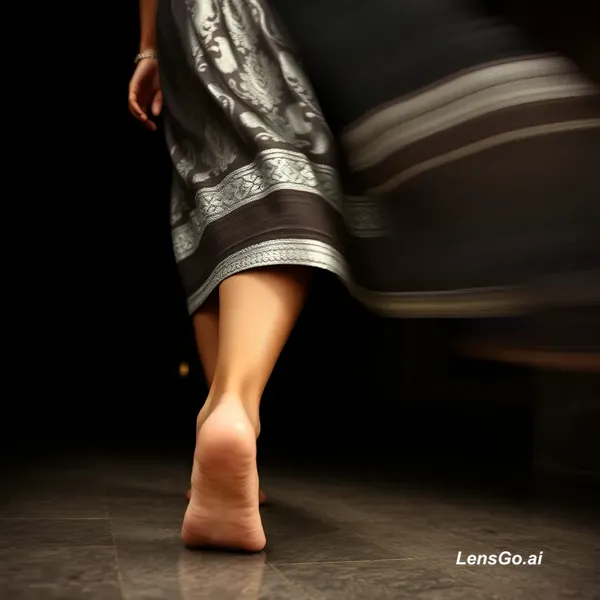 AI Image: rear low angle, bare feet walking, silver polish, silver jhanjhar motion blur, Indian woman with bla