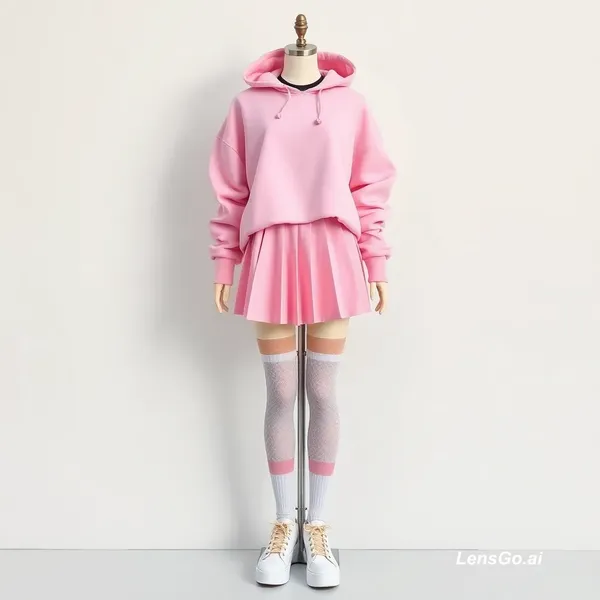 A cute pastel pink girly femboy outfit displayed on a mannequin: oversized soft pink hoodie slightly cropped, pleated pink-and-white skirt, thigh-high white and pink striped socks with subtle fishnet layering, chunky white platform sneakers, accessories including a black choker, pink bows, and arm warmers. Soft aesthetic lighting, minimal background, kawaii fashion style, highly detailed, soft textures.