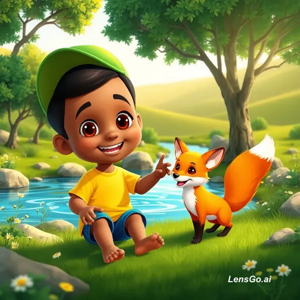 A high-quality 3D cartoon style illustration of a young Somali boy named Hirsi playing with his fox best friend near a clear flowing river. Hirsi has warm brown skin, big expressive eyes, short black hair, wearing a green cap, yellow t-shirt and blue shorts, barefoot and smiling happily. The fox is small, fluffy, bright orange with white chest and tail tip, playful and friendly. They are in a beautiful green landscape with trees, flowers, rocks, and soft sunlight. Background includes rolling hills.
