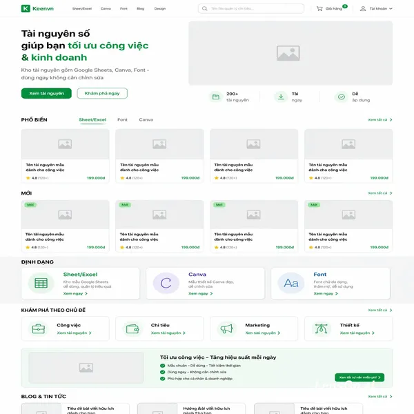Design homepage wireframe for Keenvn (digital downloads: Sheets, Canva, Fonts). No real images → use placeholders. Style: clean SaaS, white bg, primary green #16A34A, light gray sections. Layout: 1200px container, 12-col grid, spacing ~80px, cards radius ~10px. HEADER (sticky): Logo | Menu: Sheet/Excel, Canva, Font, Blog, Design | Search ("Tìm file quản lý chi tiêu...") | Cart | Account HERO (2 cols): Left: H1: "Tài nguyên số giúp bạn tối ưu công việc & kinh doanh" Sub: "Kho tài nguyên gồm Google Sheets, Canva, Font - dùng ngay không cần chỉnh sửa" CTA: [Xem tài nguyên] | [Khám phá ngay] Right: [Product Placeholder] Below: "200+ tài nguyên" | "Tải ngay" | "Dễ áp dụng" PHỔ BIẾN: Title + Tabs (Sheet/Font/Canva) Grid 4 cols Card: [Image] Title (2 lines) ★4.8 (120+) 199.000đ Hover: "Xem chi tiết" MỚI: Same grid + badge "Mới" ĐỊNH DẠNG (bg xám): 3 cards: Sheet / Canva / Font + text ngắn + "Xem ngay" KHÁM PHÁ: 4 cards: Công việc / Chi tiêu / Marketing / Thiết kế + "Xem tài nguyên" BANNER: [Banner Placeholder] + Title + bullets + "Xem tất cả" BLOG: 3 cards: [Image] Title + meta + date CTA: "Cần tài nguyên theo yêu cầu?" + "Liên hệ tư vấn miễn phí" FOOTER (dark): Giới thiệu | Chính sách | Blog | Hỗ trợ Rules: max 12 items/section, no long text, uniform grid, placeholders only
