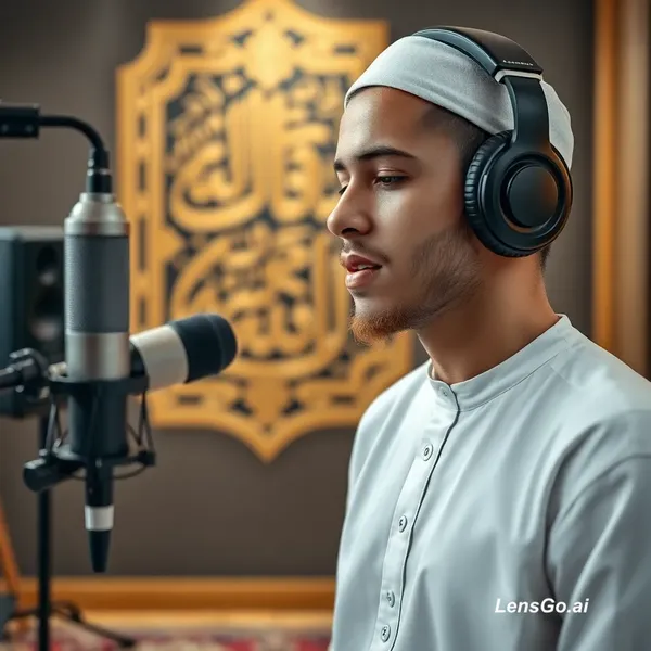 AI Image: Young Muslim boy (18-20 years old) recording Islamic song in a modern studio, white panjabi, white p