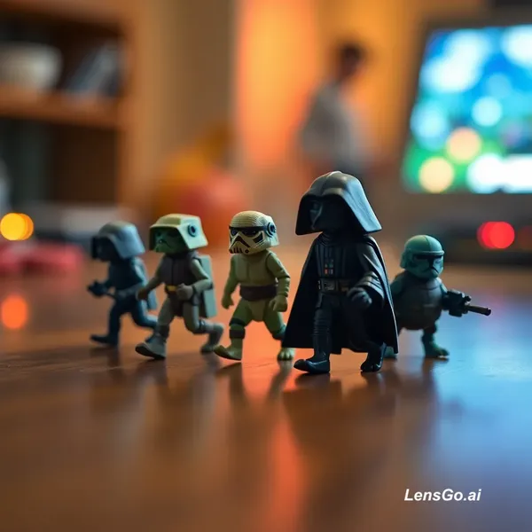 AI Image: Miniature Star Wars inspired creatures walking across a tabletop, tiny detailed figurines with soft