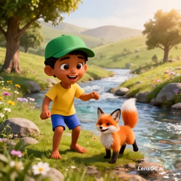 A high-quality 3D cartoon style illustration of a young Somali boy named Hirsi playing with his fox best friend near a clear flowing river. Hirsi has warm brown skin, big expressive eyes, short black hair, wearing a green cap, yellow t-shirt and blue shorts, barefoot and smiling happily. The fox is small, fluffy, bright orange with white chest and tail tip, playful and friendly. They are in a beautiful green landscape with trees, flowers, rocks, and soft sunlight. Background includes rolling hills.