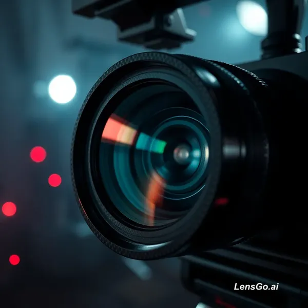 Extreme close-up of a high-end anamorphic cinema lens reflecting studio lights. Sleek carbon fiber camera rig details. The background is a dark, out-of-focus movie set with subtle red glowing indicators and atmospheric fog. Luxury tech aesthetic, hyper-realistic, dramatic shadows, moody lighting.