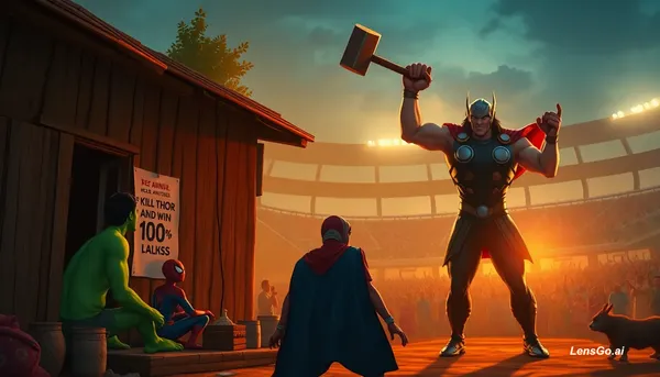 Create a cinematic anime style video. Scene 1: A small poor village, Hulk and Spider-Man living with old mother. Scene 2: Hulk sees a poster on wall saying "Kill Thor and win 100 lakhs". Scene 3: Big stadium full of crowd cheering. Scene 4: Thor enters with glowing hammer, dramatic slow motion. Scene 5: Fight scene between Hulk and Thor. Scene 6: Emotional talk, Thor gives prize money. Scene 7: Happy ending in village, sunset background.