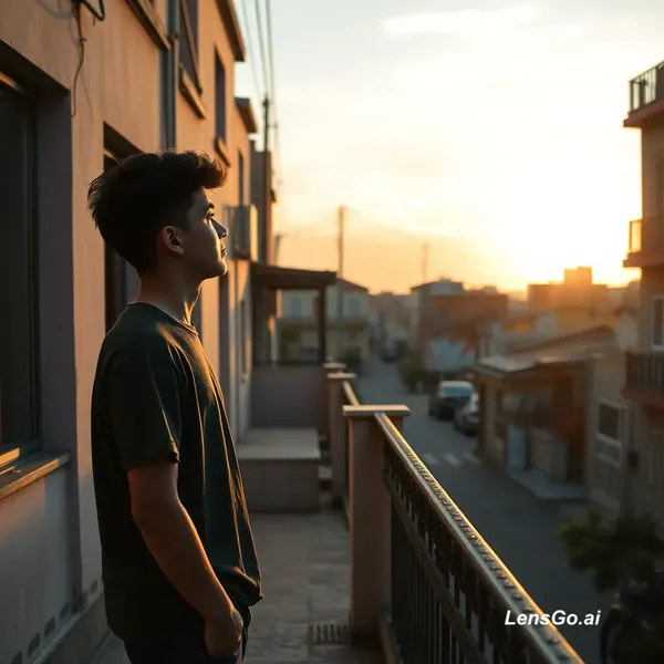 A quiet small town street at dawn, soft sunlight, a teenage boy named Ahmed standing on a terrace, looking at the sky lost in dreams, gentle breeze, cinematic realistic style, reflective mood.