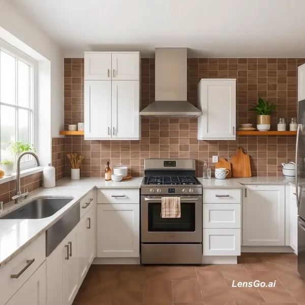 AI Image: Improve the layout and design of this kitchen. Keep the brown tiles