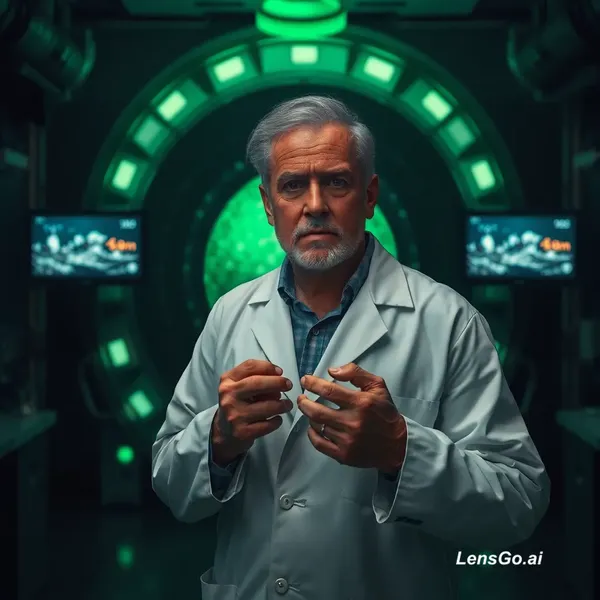 AI Image: Prompt for Video: High-tech laboratory at night, middle-aged scientist inspired by Bruce Banner wear