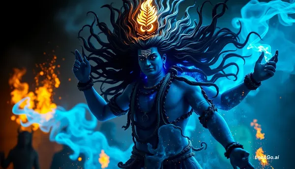 AI Image: A hyper-realistic cinematic scene of Lord Shiva performing cosmic Tandava, glowing blue aura, matted