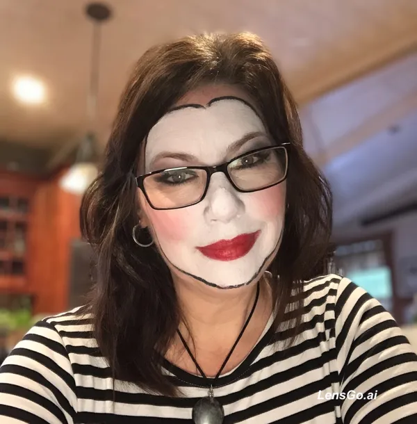 AI Image: change her brown shirt to a black and white striped one, she is applying mime makeup, white oval out