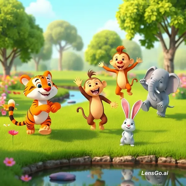 Create a fun and colorful 3D Pixar-style cartoon animation video of exactly 2 minutes. Scene: A group of cute animals — friendly orange tiger, naughty monkey, dancing elephant, and a small rabbit — are playing and singing happily together in a beautiful sunny green park with flowers, trees, and a small river. They are jumping, chasing each other, rolling on grass, doing funny dances, high-fiving, and singing a joyful Hindi song together. Bright vibrant colors, smooth Pixar quality animation, very energetic and happy mood. Camera angles: Close-ups on faces while singing, wide shots of them playing, fun dynamic movements. Add a catchy, happy kids background music with dholak and flute. Vertical 9:16 format for YouTube. High quality, viral cute vibe.