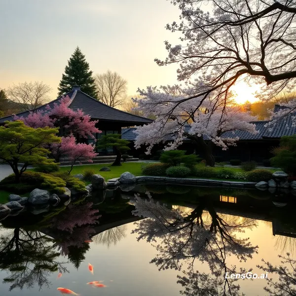 AI Image: A serene Japanese garden at golden hour, koi pond reflecting cherry blossoms
