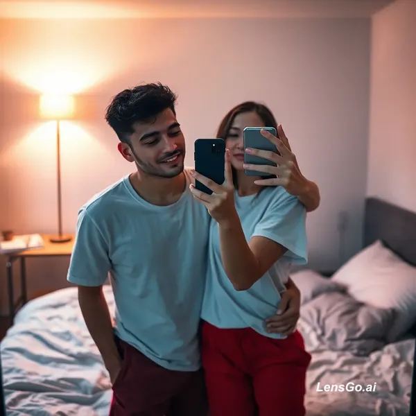 AI Image: ultra realistic iPhone mirror selfie of a young couple in a cozy bedroom, natural lighting mixed wit