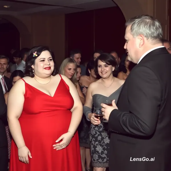 AI Image: A fat woman in a red dress stands beside a man in the midst of all the middle. They should be the ma