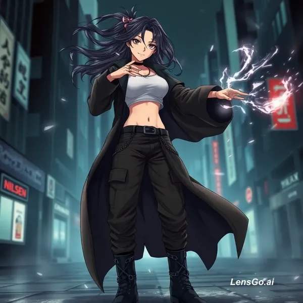 Anime-style female sorcerer inspired by Jujutsu Kaisen, resembling the user, dynamic pose with shadow/light powers, long flowing dark coat, crop top, cargo pants with straps, combat boots, subtle chains and rings, glowing cursed energy aura, expressive confident face, wind in hair and coat, dark urban city background, cinematic anime lighting, highly detailed"