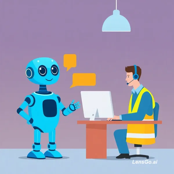 AI Image: Modern flat vector illustration in soft pastel colors. On the left side, a friendly blue AI chatbot
