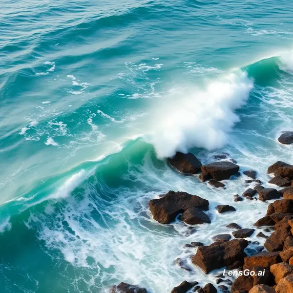 AI Image: Slow-motion ocean waves crashing on a rocky coastline, turquoise water, white foam spray, steady tra