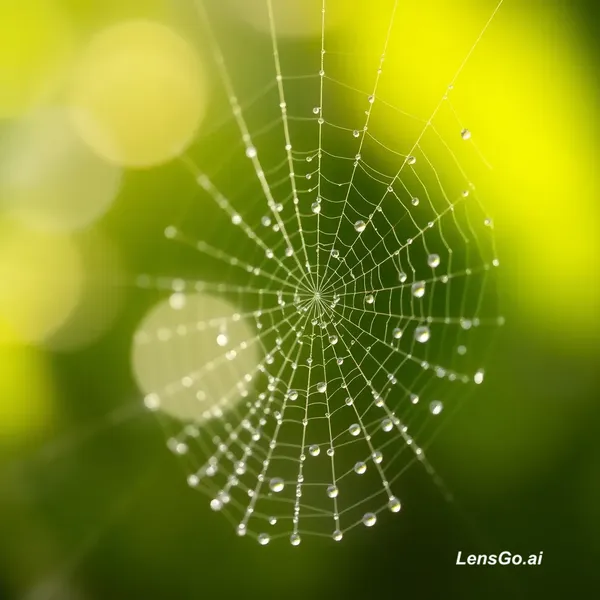 AI Image: Macro photograph of morning dew on spider web, bokeh background