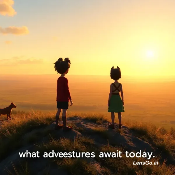 Pan from hilltop down to prairie, Dred and Lan looking over the horizon, soft morning light, cinematic Pixar style, audio: American male neutral voice says “Let’s see what adventures await today.”»