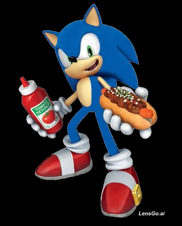 AI Image: Sonic the Hedgehog is holding a chilli dog and a bottle of tomato ketchup.