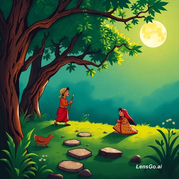 AI Image: "Ek ghane jungle ke kinare ek chhota sa gaon tha, jahan ek shararti bandar Mintu aur ek seedhi-saadh