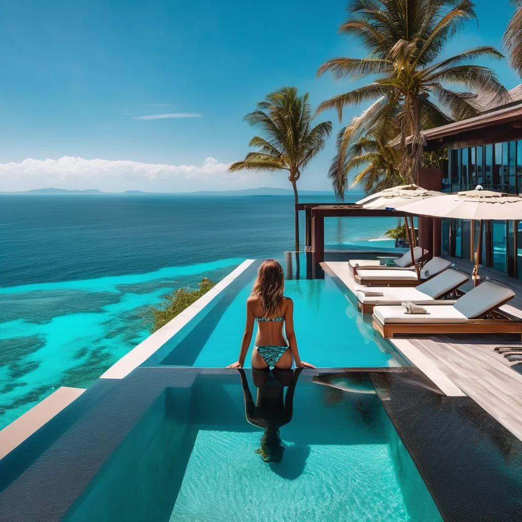 AI Image: a girl in bikini posing at stunning infinity pool overlooking ocean, luxury resort, modern architect