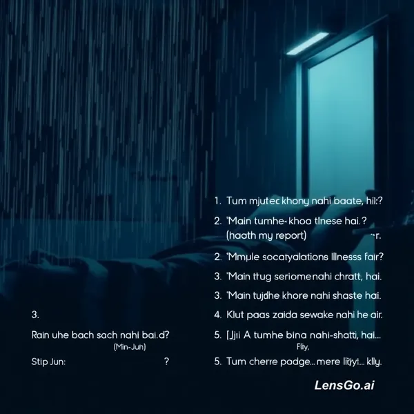 Step 1: (Setting) Rain ho rahi hai… night time… hospital ke bahar. Girl (Ji-A) ro rahi hai. Step 2: (Entry) Boy (Min-Jun) weak condition me aata hai, haath me report. Step 3: (Dialogue) Ji-A: “Tum mujhe sach kyu nahi bataye…?” 😢 Min-Jun (slow voice): “Main tumhe khona nahi chahta tha…” Step 4: (Twist Reveal) Min-Jun: “Mujhe serious illness hai… mere paas zyada time nahi hai…” Step 5: (Emotional Peak) Ji-A usko hug karti hai: “Main tumhare bina nahi reh sakti…” Min-Jun: “Tumhe rehna padega… mere liye…” 💔 Step 6: (Climax Moment) Rain aur tez… dono ro rahe… background sad music. Step 7: (Ending) Min-Jun slowly door chala jata hai… Ji-A wahi gir ke roti hai… Screen black…